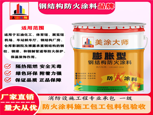 室外超薄型钢结构全椒防火涂料是一种由复合材料、阻燃材料、防火填料等组成,并选用最新型的阻燃剂、发泡、发炭、催化剂等加工而成的新型全椒防火涂料。该涂料涂层薄、用量少、耐火时间长,粘结力强,耐候、抗冲击、耐冻融性好。并具有较好的耐化工大气腐蚀性,涂层遇火时迅速膨胀增厚,形成发泡致密、均匀的隔热层,延长了耐火时间,从而达到防火保护作用。耐火时间根据等级不同可达0.50 h -2.00 h不等。